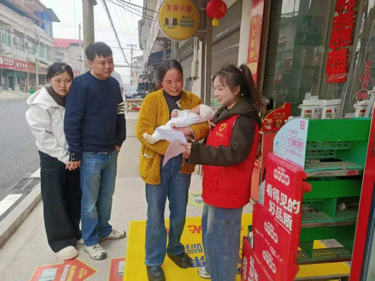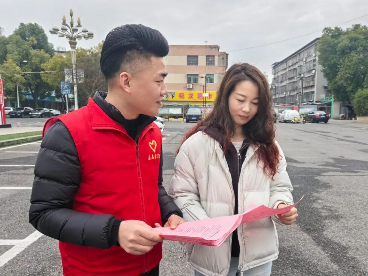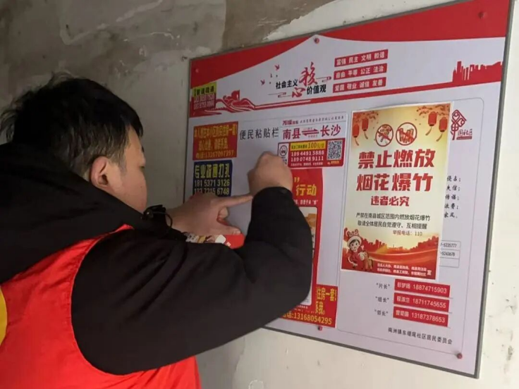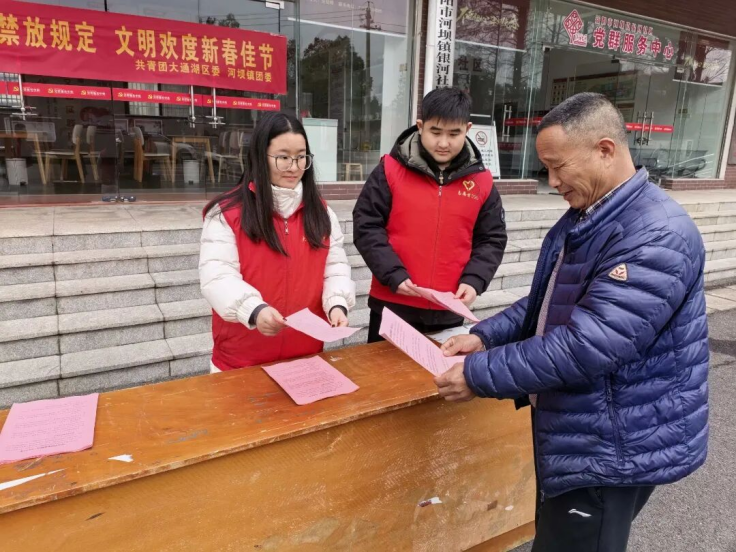 在大通湖区河坝镇,青年志愿者走进街巷、社区,向居民讲解燃放危害与禁放规定,发放倡议书,倡导用绿色文明方式欢度新春。