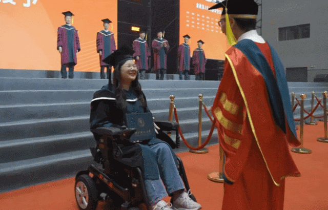 陈紫澜被大众关注是在南科大的毕业典礼上,校长薛其坤走下典礼台,俯身为她拨穗,很多网友赞叹这个行动不便却不甘屈服的女生。